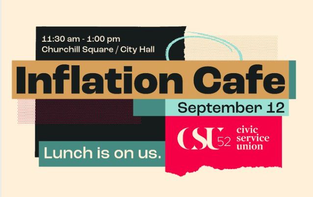 September 12th, Tuesday – Inflation Cafe hosted by Civic Service Union 52: “Civic Service Union 52 (CSU 52) extends a warm invitation to you to visit our Inflation Cafe Pop-Up on September 12 from 11:30am-1:00pm at Churchill Square in downtown #YEG. The first 200 people to attend will receive a complimentary lunch on the members of CSU 52… with a twist. This lunchtime event aims to be a unique demonstration to show the effects of inflation and to provide a platform for open dialogue and discussion about the challenges facing our community due to rising living costs. This will be a great opportunity to hear from your fellow Civic Service Union 52 members, community leaders, and concerned Edmontonians who are directly impacted by the current economic challenge.”