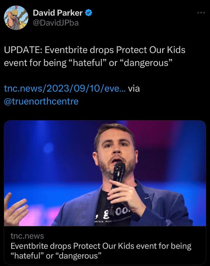 More info: Eventbrite – this link no longer works because Eventbrite found it “hateful” or “dangerous” – see the Tweet below from Daivd Parker. Please note that True North that he is quoting is where his wife works. Good going Eventbrite. They were probably responding to complaints by local activists that found this event distasteful. This is how activism works.