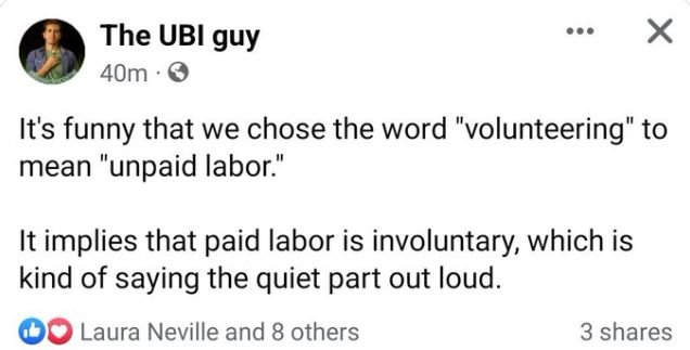 - No raises for public servants until the minimum wage is a living wage! – every segment of the workforce will tend to stand up for what they will benefit from taking action. We need a living wage/universal basic income right across our country.