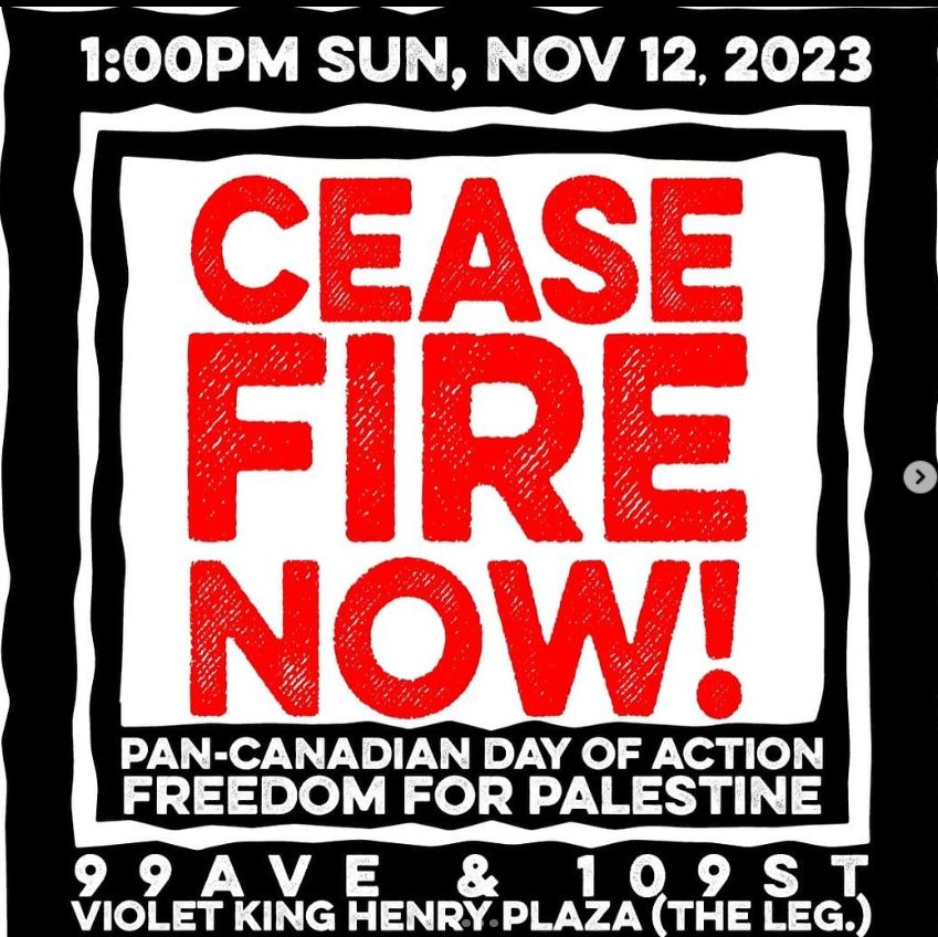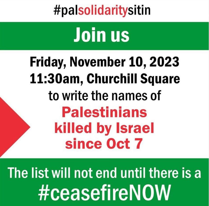 November 10th, Friday – Writing Names of Palestinians Killed since October 7th: Join Climate Justice Edmonton who is hosting a name writing event. “Every child killed in Gaza today would be alive if we had a ceasefire yesterday”