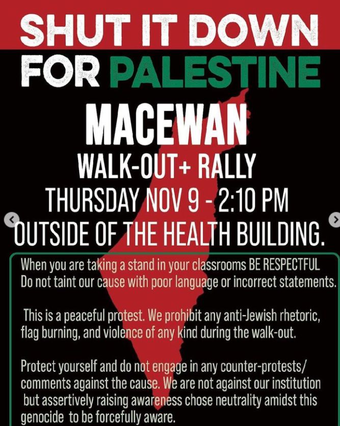 November 9th, Thursday – Shut It Down for Palestine: This is a student walk-out at the MacEwan University.