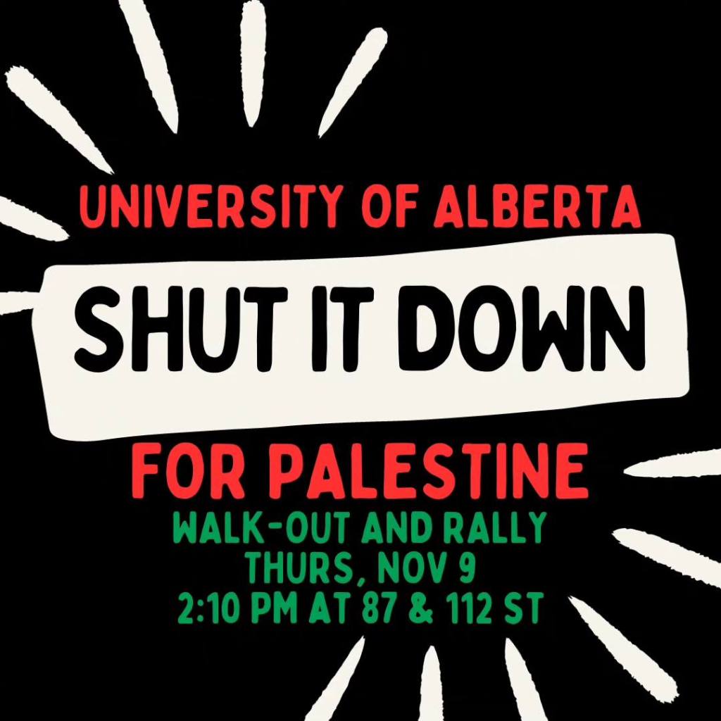 November 9th, Thursday – Shut It Down for Palestine: This is a student walk-out. at the University of Alberta.
