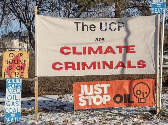 Why do I have UCP on this sign? Well, they form the present government in Alberta and like all previous Alberta governments (including the NDP) have pushed the fossil fuel agenda to the detriment of the planet while knowing what impacts their actions would have on people and planet.