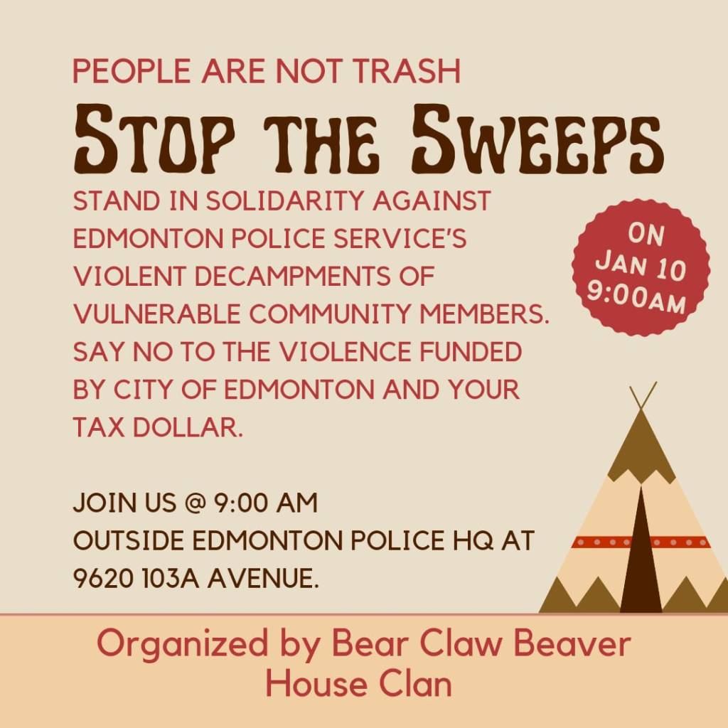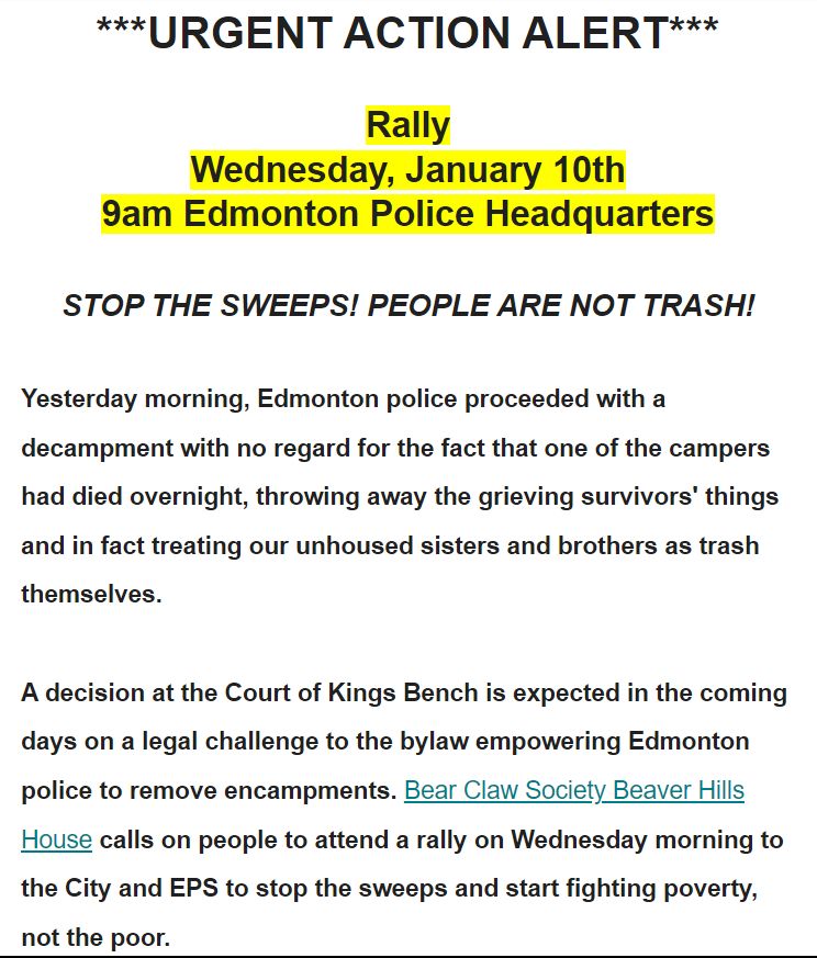 January 10th, Wednesday – Stop the Sweeps Rally: “A decision at the Court of Kings Bench is expected in the coming days on a legal challenge to the bylaw empowering Edmonton police to remove encampments. Bear Claw Society Beaver Hills House calls on people to attend a rally on Wednesday morning to the City and EPS to stop the sweeps and start fighting poverty, not the poor.”