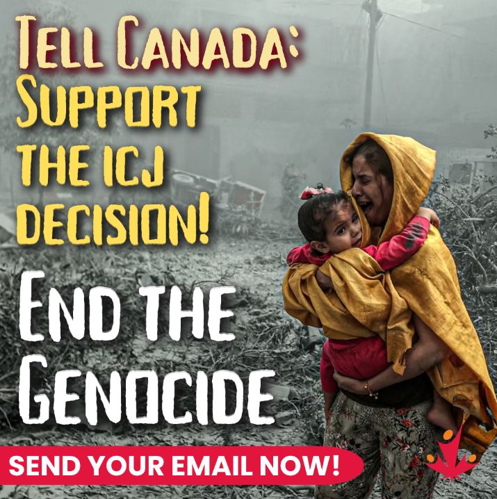 “…. the International Court of Justice (ICJ) released its important decision imposing preliminary measures on Israel to avert the genocide of Palestinians in Gaza. Among other things, the ICJ demanded that Israel 1) take measures to end any genocidal violence in Gaza, 2) prevent and punish incitement to genocide by its leaders, and 3) allow humanitarian aid to flow into Gaza. While the ICJ did not demand a ceasefire, South Africa’s Foreign Affairs Minister asserted that “by implication, a ceasefire must happen.” Please join CJPME in insisting that Canada strongly affirm the Court’s legally binding ruling. Among other things, Canada should 1) firmly condemn Israel’s genocidal violence in Gaza; 2) pressure Israel to fully comply with the ICJ’s emergency provisions; 3) end all arms trade between Canada and Israel, and 4) reassess Canada’s diplomatic stance toward Israel.