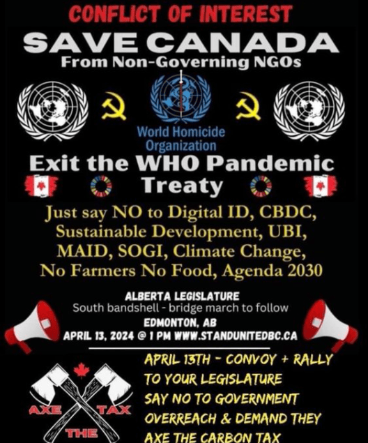 April 13th, Saturday – Save Canada from Non-Governing NGO’s: This is put here for information purposes only. This group is calling for actions across Canada. Last Saturday there were several vehicles in Edmonton demonstrating for #AxeTheTax, #CarbonTax, etc.