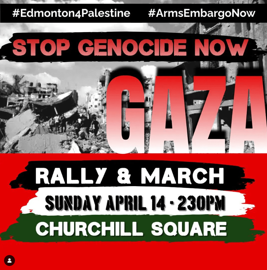April 20th, Saturday – Climate Justice Signage Display: I will erect these signs beside the bus stop on Gateway and 83rd Avenue. This is a static display since I normally go over and stand with a group of people doing Ceasefire Now activism in front of the market (see event above). On April 6th, someone tore the banner in half and I have not repaired it yet. I plan on erecting other signs in its place.