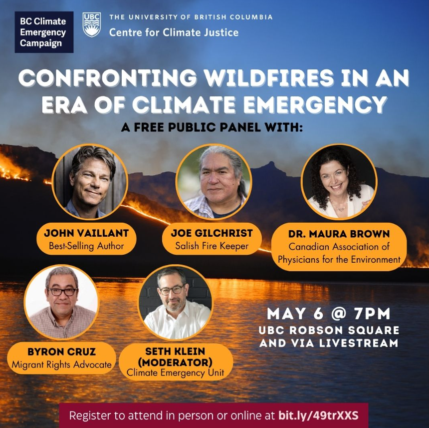 May 6th, Monday – Confronting Wildfires in an Era of Climate Emergency: “Join the BC Climate Emergency Campaign and the UBC Centre for Climate Justice for a public panel discussion on wildfires and the climate crisis. The panel will explore how to balance investments in emergency response and climate preparedness with spending on climate action that drives down emissions, so that we can reduce extreme weather events, ensure our communities and workers are safe, and ensure a liveable world for future generations.”