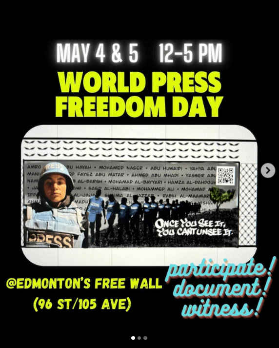 May 4th and 5th – World Press Freedom Day(s): “Edmonton Mark your Calendar! Join a group of Journalists, artists and activists in Edmonton to write the names of Gaza’s Journalists and media workers who were killed by the IsraHell Occupation army🚨 make a stand for media workers .. This commemoration is to name them all and let the world remember!”