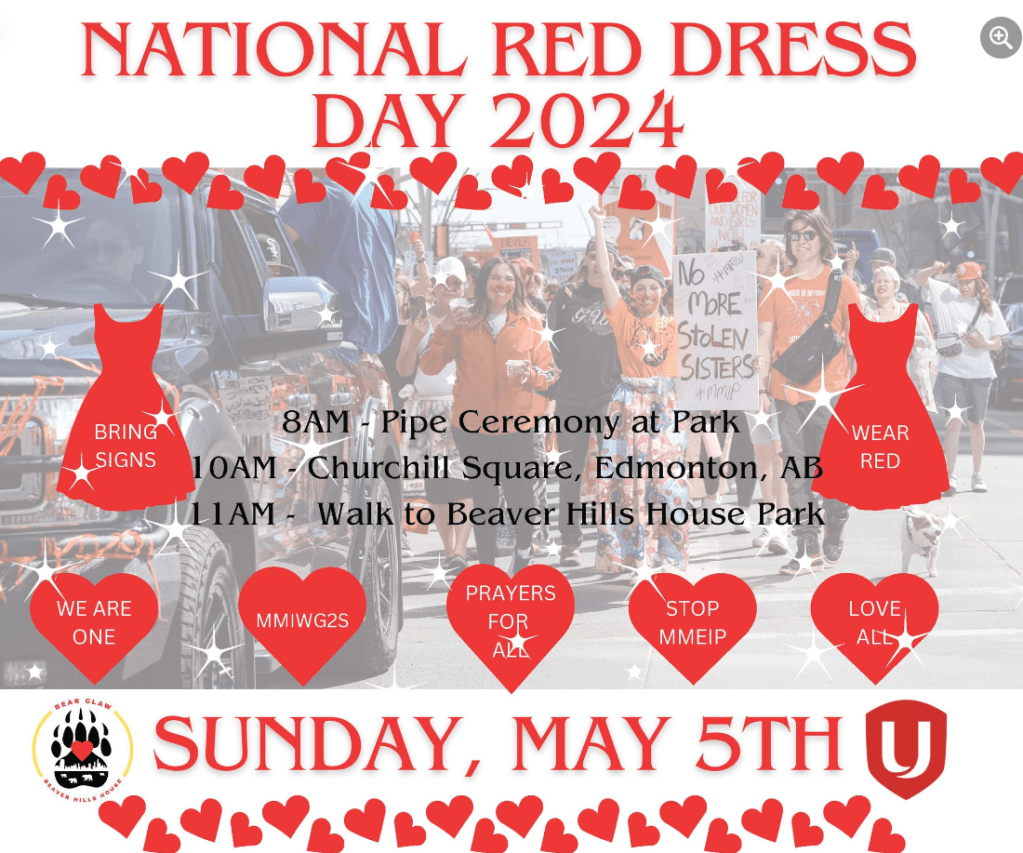 May 5th, Sunday- National Red Dress Day 2024 Edmonton: A pipe ceremony will begin the day at the Beaver Hills House Park at 8 am. A gathering at Sir Winston Churchill Square at 10 am and then a march/procession to Beaver Hills House Park.