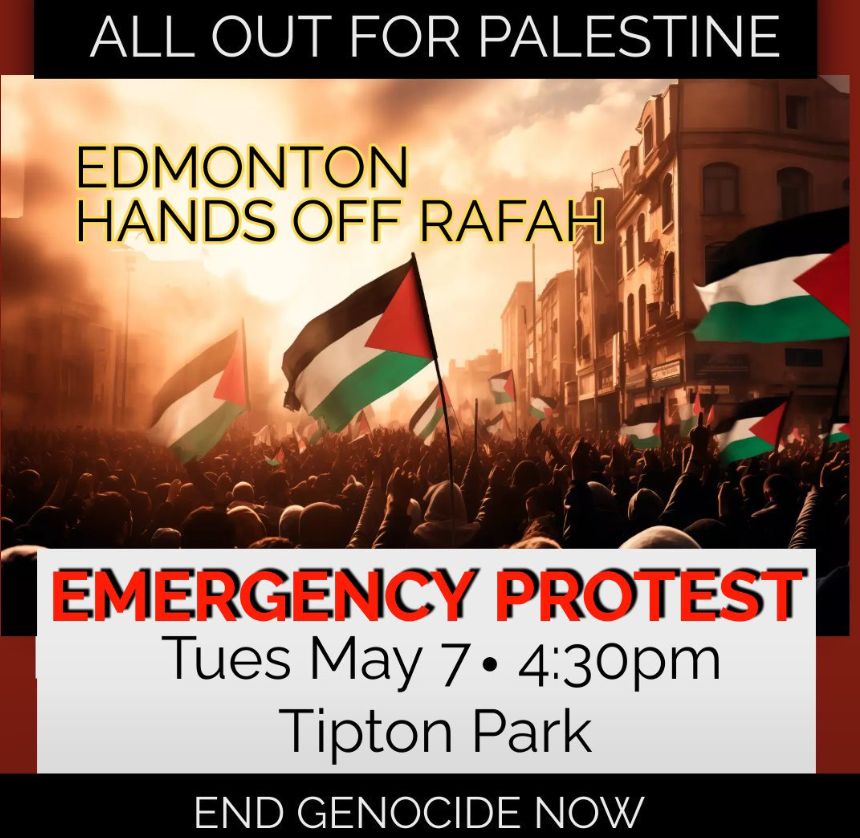 Hashtags: #HandsOffRafah #StopArmingIsrael #YEG #EndTheGenocide