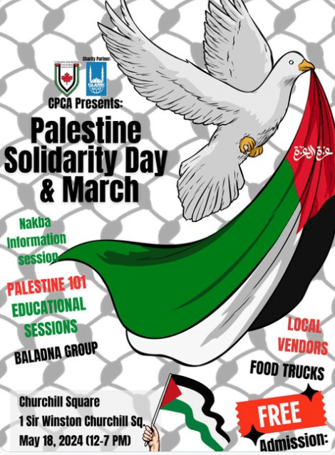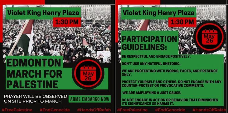 May 26th, Sunday – Edmonton March for Palestine: “Standing in solidarity for peace and justice. Join us this Sunday in Edmonton as we advocate for a two-way arms embargo and an end to the atrocities in Gaza. Together, we can make a difference! ![]()