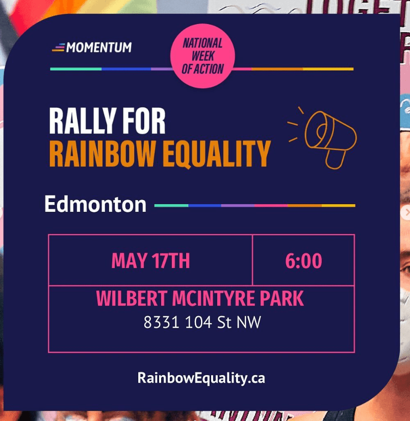 May 17th, Friday – Rainbow Week of Action: There will be an action happening in Edmonton to participate in the National Day of Action.