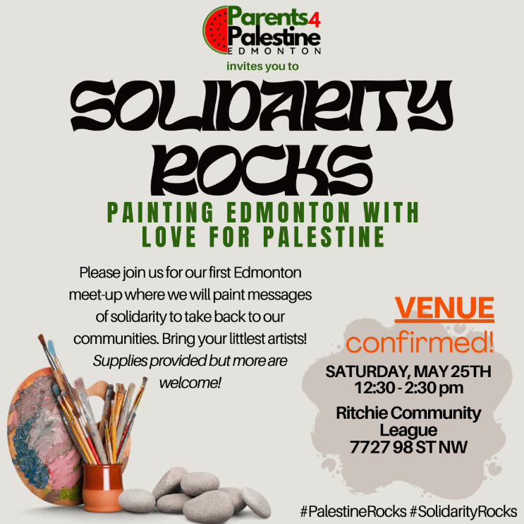 May 25th, Saturday – Solidarity Rocks: “So much has been happening in Palestine, but also in our community. Sending solidarity and strength to those families and caregivers supporting the student organizers at the @university4palestine.yeg. Please give them a follow if you haven’t already.