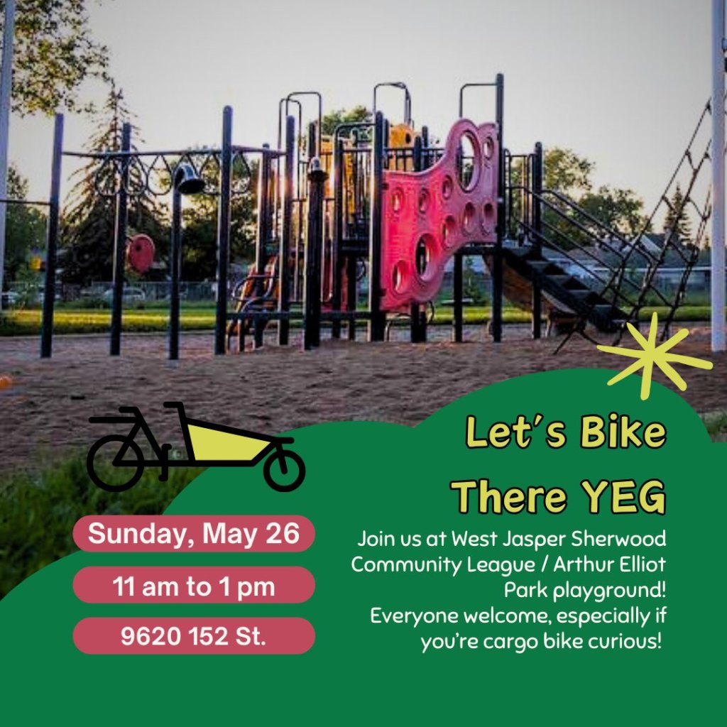 May 26th, Sunday – Let’s Bike There YEG Cargo and Electric Bike Meet-Up: “Our next event is Sunday, May 26! We are meeting at the Arthur Elliot Park/West Jasper Sherwood Community League playground, 11 am to 1 pm. If you’re curious about cargo or electric bikes, please stop by and chat with fellow riders!”