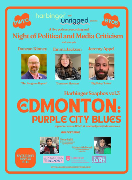 May 25th, Saturday – Night of Political and Media Criticism: Come and join Duncan Kinney (@ProgressAlberta @duncankinney), Emma Jackson (@EmmaJackson57), Jeremy Appel (@JeremyAppel1025) and @bigshinytakes‘ in the ‘City of Champions’ for a night of political & media criticism you won’t wanna miss! This is a live pod-cast recording.