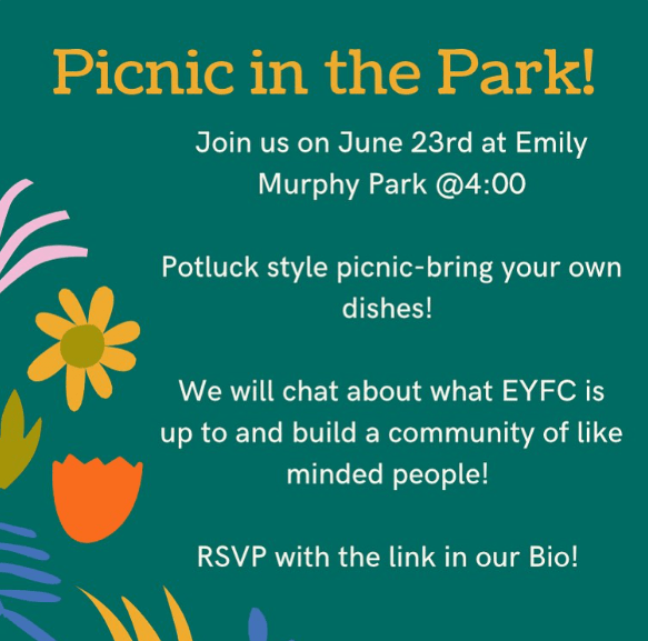 June 23rd, Sunday – Picnic in the Park with EYFC: “Join us on Sunday for a picnic in the park! 🌿🌷” This is a potluck picnic.