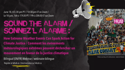 June 18th, Tuesday – Sound the Alarm!: “Last year’s wildfire season was the most destructive ever recorded in Canada. With another devastating wildfire season upon us and extreme weather events intensifying across the globe, fossil fuel CEO salaries are soaring and politicians are failing to hold them accountable. How do we as climate and social justice activists, united in our vision for a decolonized, decarbonized and just world, meet this moment?”