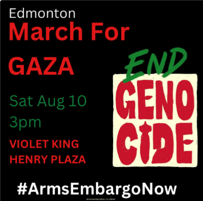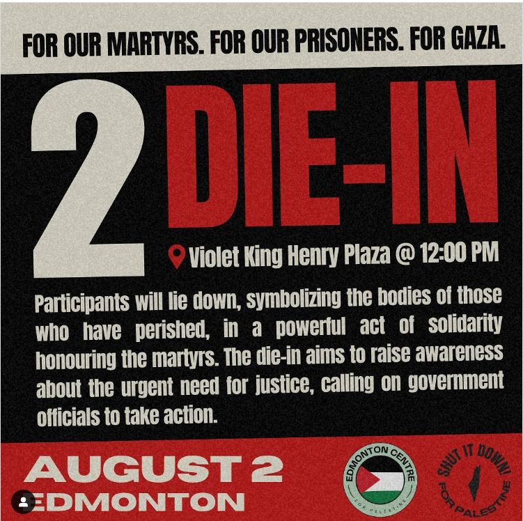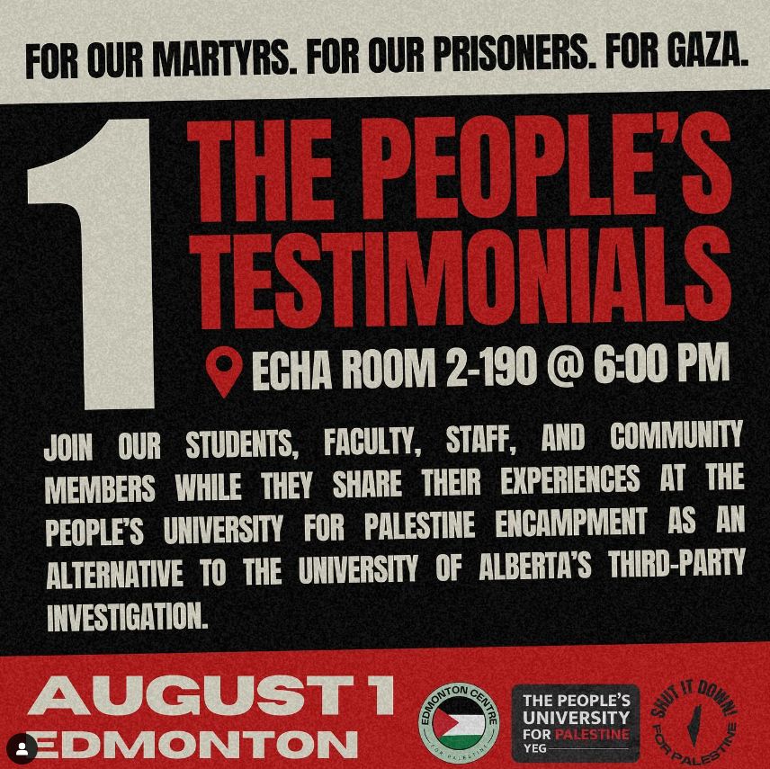August 1st, Thursday – The People’s Testimonials: “On August 1st, join our students, faculty, staff, and community members as they share their experiences of the encampment, the sweep, and the harm that was inflicted upon them at the hands of the University of Alberta as a consequence of protesting university complacency in genocide. The People’s Testimonial has been organized as an alternative to the insubstantial independent review of the University of Alberta’s decision to violently sweep the People’s University for Palestine encampment. The students, despite having been continuously betrayed by administration, have extended an invite to both U of A and MacEwan University administration and investigator Adele Kent.