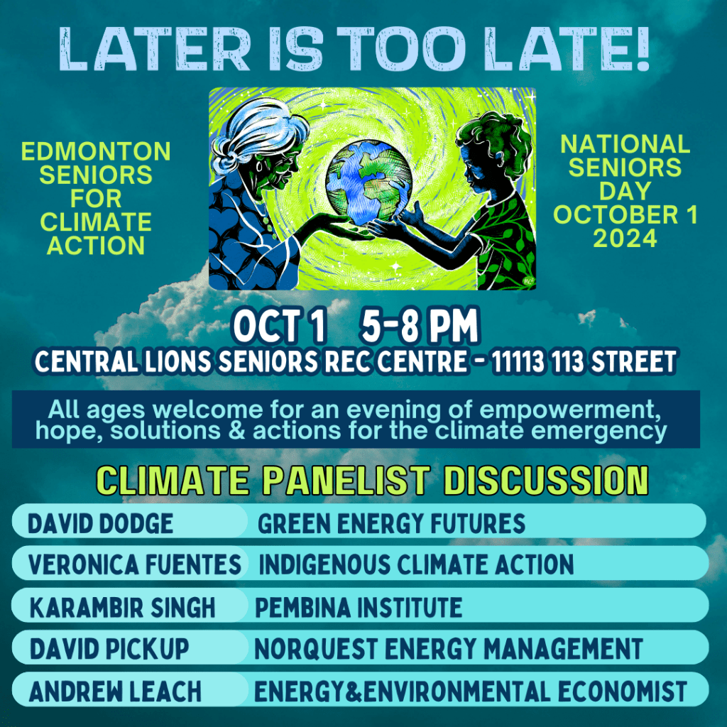 October 1st, Tuesday – Climate Panel Discussion: Later Is Too Late: Join us for an evening with expert panellists and fellow Edmontonians to hear about climate crisis solutions and discuss rebuilding a healthy environment for future generations.