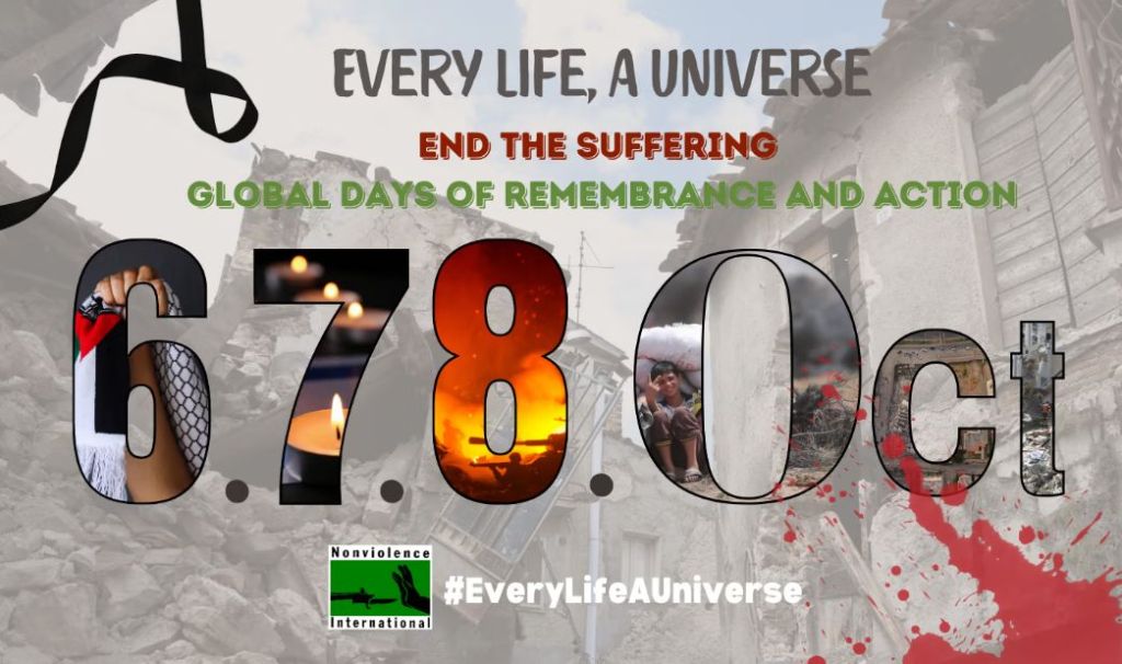 October 6th, 7th, & 8th – Global Days of Remembrance and Action: “Join us in your own way to say that violence, whether in defense or for liberation, is not the answer. Only nonviolence, which dismantles systems of oppression and violence and calls for collective justice and equality, will ensure that Israelis and Palestinians can live together in safety, peace, and justice.”