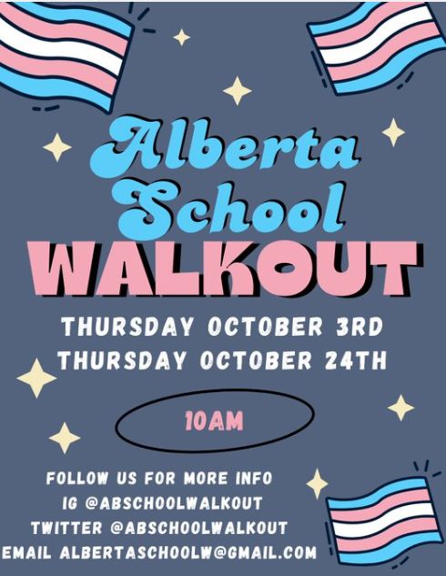 October 24th, Thursday – Alberta School Walkout: Students and supporters are encouraged to exit class quietly for 30-45 minutes and then return to your classes. Contact us if you need help locating information about your school. #ProtectTransKids #ABSchoolWalkout