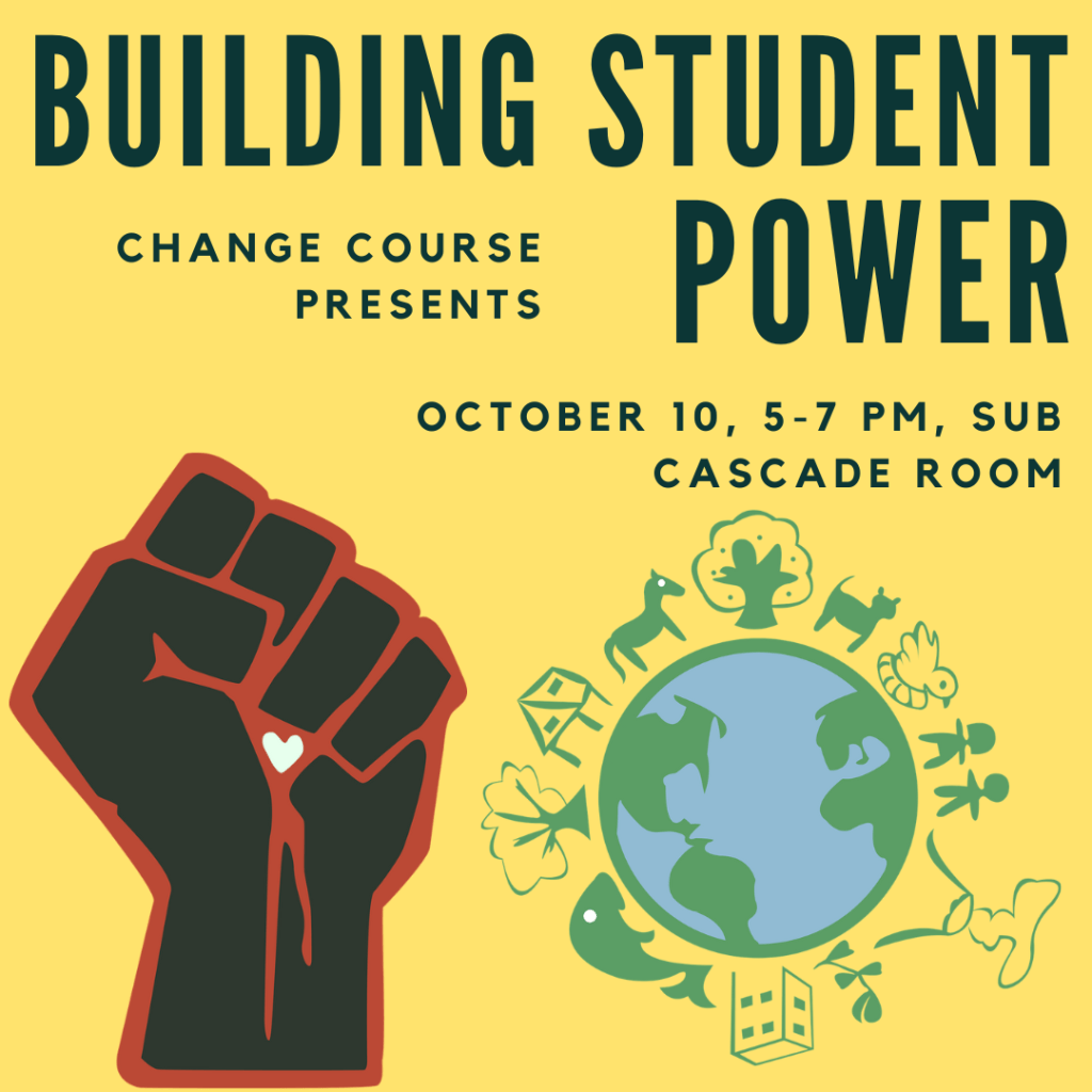 October 10th, Thursday – Building Student Power Workshop: hosted by Change Course. This workshop is an introduction to student activism and building student power on campus. Students will learn how to move from taking individual action to taking collective action on issues that matter to them, including climate justice and Indigenous rights, and how we can organize together to make institutional change.