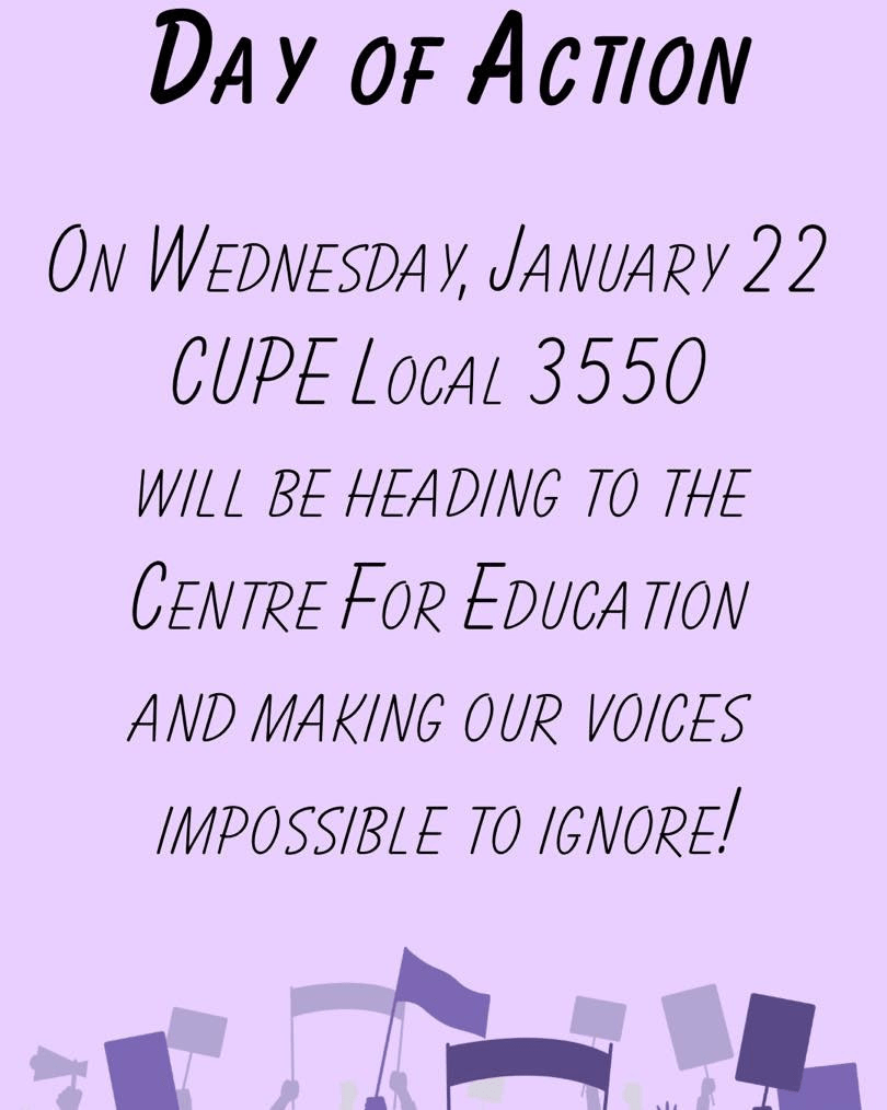 January 22nd, Wednesday Day of Action for CUPE Local 3550: “Join us tomorrow at the CUPE 3550 Day of Action rally, where we’ll be standing in solidarity with educational support workers who are demanding better for our public services!