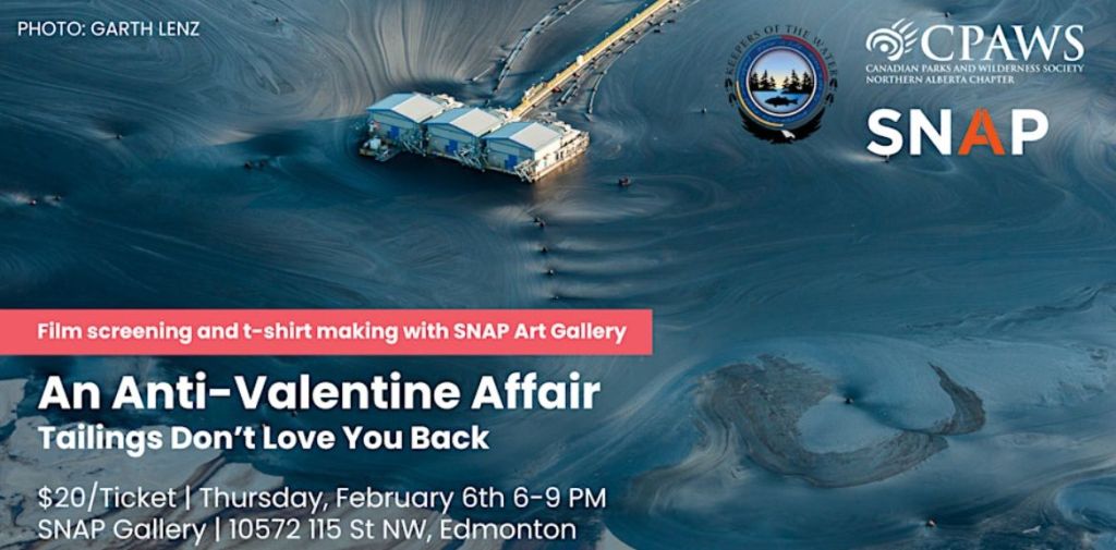 February 6th, Thursday – An Anti-Valentine Affair: Tailings Don’t Love You Back: “To commemorate the 2-year anniversary of the Imperial Oil Kearl Mine tailings spill, we are hosting an event with the SNAP Gallery in Edmonton. Join us for a screening of “Killer Water” by Brandi Morin and the opportunity to make print slogans like “Dear Alberta, Break up with Tailings” or “Tailings are Toxic, like my ex” onto a t-shirt, tote or paper. Please bring a T-shirt or Tote if you’d like to partake in the silk-screening activity. Our Boreal Program Manager, Kaitlyn Philip will share some words on our current tailings project. Tickets are $20/each.”