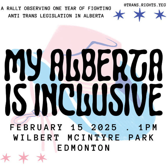 February 15th, Saturday – My Alberta is Inclusive: “For one year our province has been dialled in to an active fight for trans rights. Come together to commemorate this and show we still have plenty of gas in the tank. If this fight is far from over, let’s show them the fight we have in us.”