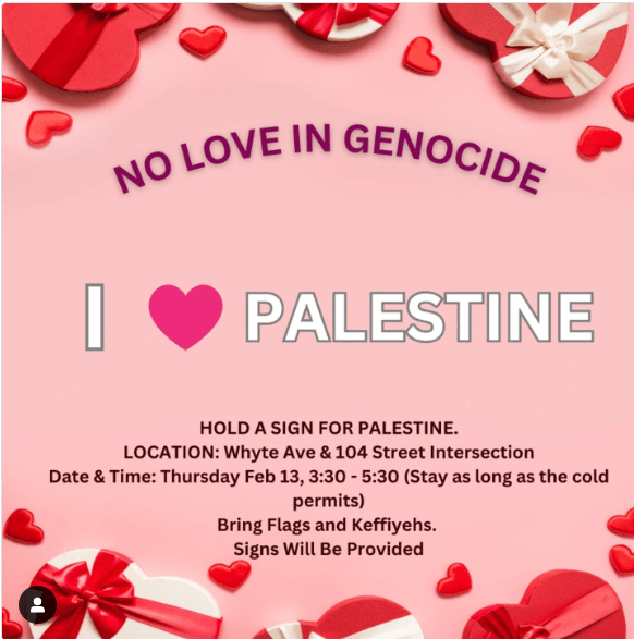 February 13th, Thursday – No Love in Genocide: “Show up for this low risk action to continue raising awareness about the ongoing genocide and occupation in Palestine. We will be there during high traffic hours, and our target audience is the drivers passing by. Come grab a sign from one of the organizers at the intersection then choose a spot to stand where it’s easy for drivers to read your sign. Please spread out throughout the intersection to maximize our presence.