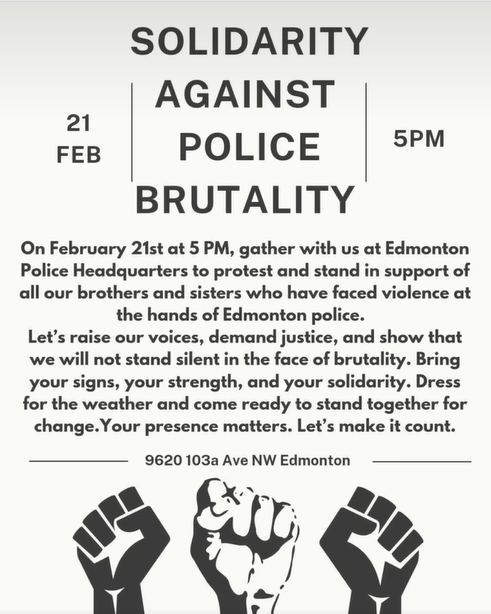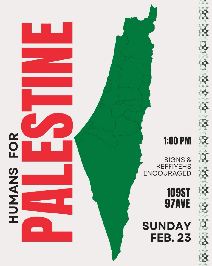 February 27th, Thursday – Weekly Action for Palestine: “”Join us this Thursday, February 27, as we stand in solidarity with Palestine! 🕊✊ Protest on Whyte Ave & 104 St Intersection from 4:00-6:00 PM. We will be holding signs for Palestine 🇵🇸🇵🇸🇵🇸🇵🇸. Bring your flags, your voice, and your passion for justice. Let’s make noise for Gaza and show the world Edmonton stands with Palestine! 🚗💨 #YEG #Edmonton4Palestine #FreePalestine #StandWithGaza #Solidarity“