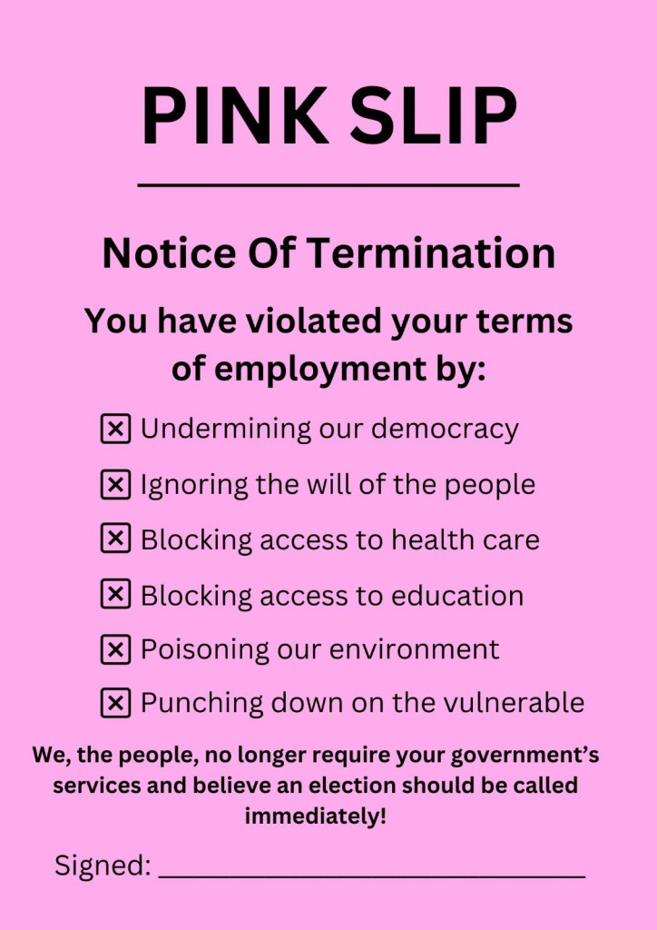 If you can’t make it to our Pink Slip event on February 22nd at 1 pm at the Alberta Legislature we invite you to particiapte in a virtual delivery of your very own Pink Slip.