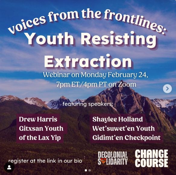 RSVP to join Gitxsan and Wet’suwet’en Youth in a webinar on February 24, 7pm ET/4pm PT on Zoom. 👩🏽💻