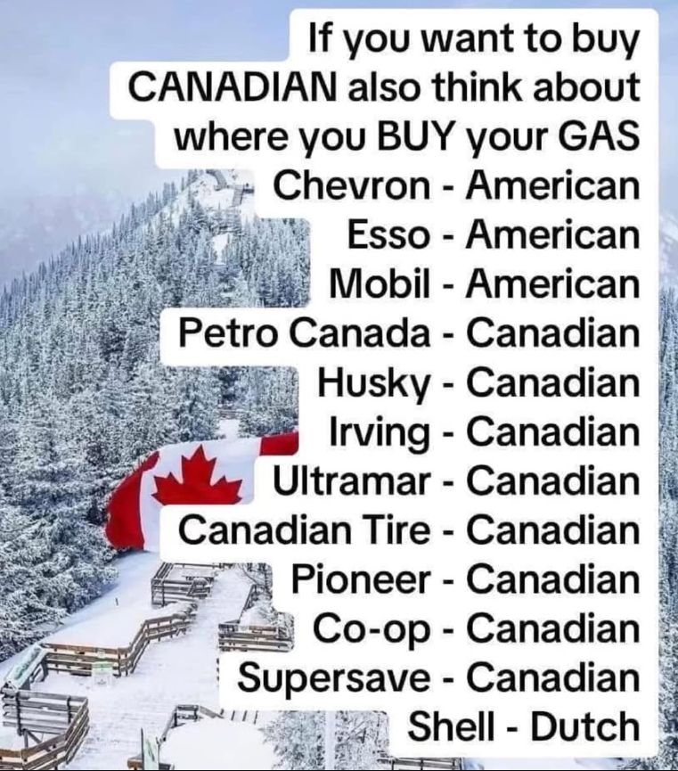 If you are going to buy a coffee – buy from a local independent cafe (Tim Hortons is NOT Canadian), gasoline – buy from businesses that are not corporate (if it has Shell, Mobil, Exxon, etc on the station don’t buy there) like Domo, EconoGas, etc since the retail profit is not going into those corporations, NO Amazon, No Home Depot, No Wallmart, No McDonalds, No Pizza Hut, No KFC etc.