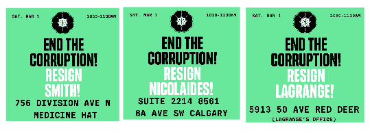March 1st, Saturday – Resign Actions: Public Interest Alberta is promoting three actions at UCP constituent office – Red Deer, Medicine Hat, and Calgary. If you are in one of those municpalities your presence would be greatly appreciated.