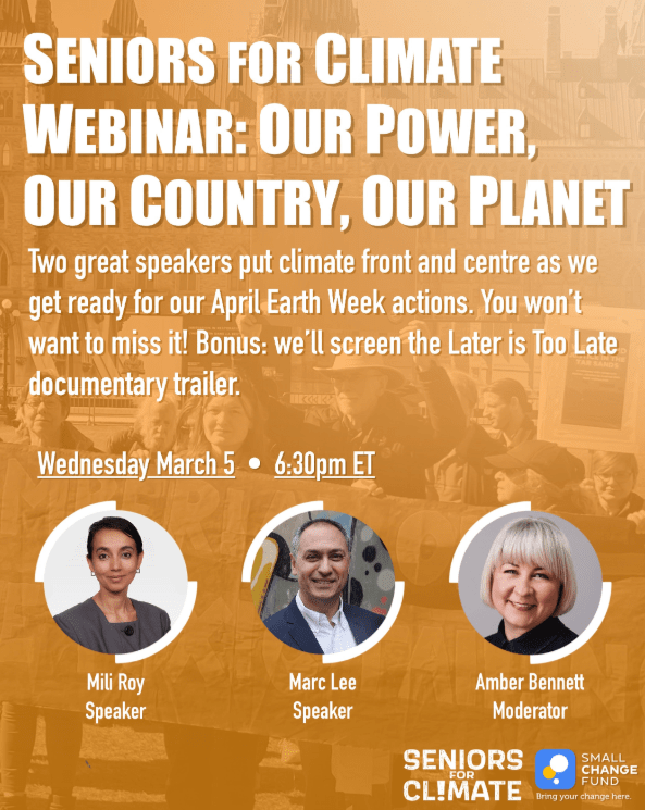 March 5th, Wednesday – Our Power, Our Country, Our Planet: “You won’t want to miss this compelling conversation – we’re excited to be welcoming Dr. Mili Roy and Marc Lee as our speakers, and there will be information about the lead up to our spring day of action, as well as a viewing of the Later is too Late documentary trailer.