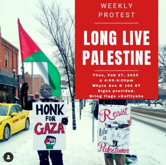 February 27th, Thursday – Weekly Action for Palestine: “”Join us this Thursday, February 27, as we stand in solidarity with Palestine! 🕊✊ Protest on Whyte Ave & 104 St Intersection from 4:00-6:00 PM. We will be holding signs for Palestine 🇵🇸🇵🇸🇵🇸🇵🇸. Bring your flags, your voice, and your passion for justice. Let’s make noise for Gaza and show the world Edmonton stands with Palestine! 🚗💨 #YEG #Edmonton4Palestine #FreePalestine #StandWithGaza #Solidarity“