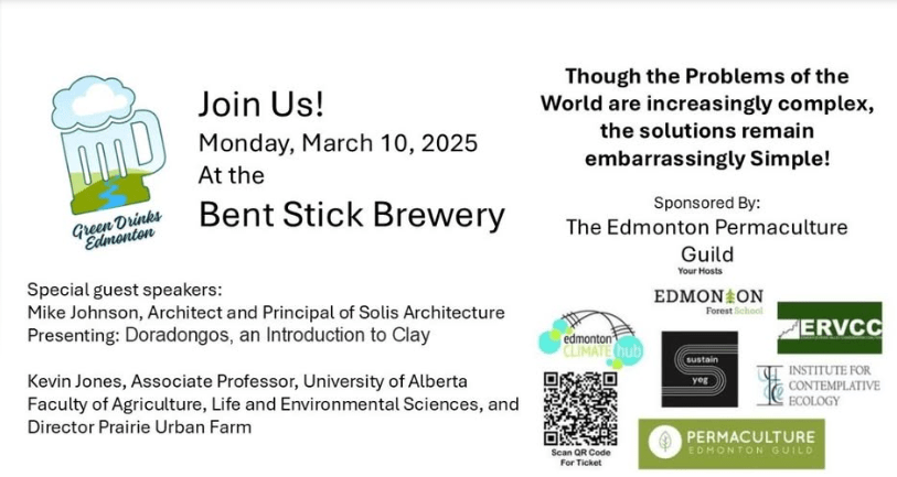 March 10th, Monday – Green Drinks Edmonton: “Have we got a night planned for you! The March 10th Event is hosted by the Edmonton Permaculture Guild and they are pretty excited to have you join them.”
