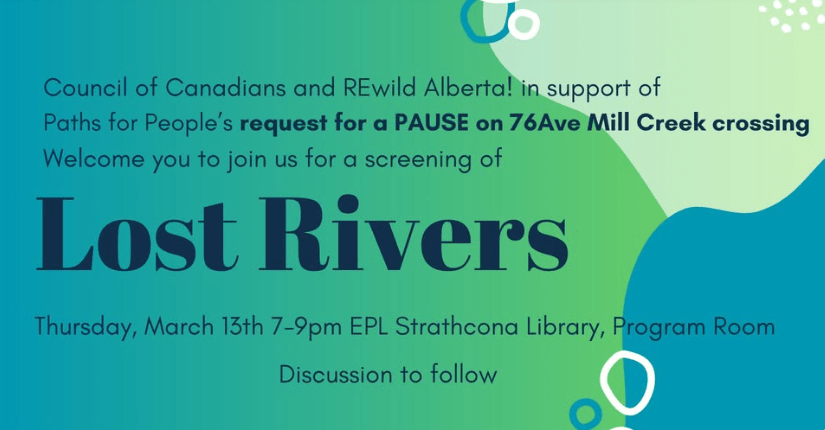March 13th, Thursday – Lost Rivers: “You are cordially invited to join us – Edmonton Chapter Council of Canadians, Rewild Alberta! and Paths for People – in celebration of The International Day of Action for Rivers 2025.