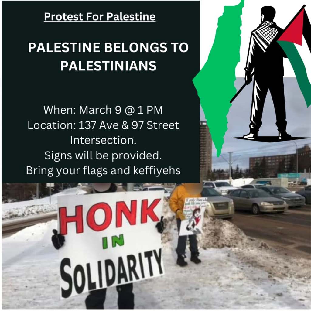 March 9th, Sunday – Palestine belongs to Palestine: This will be a human presence where people hold up signs to drivers and pedestrians to remind them about Palestine. Honk for Solidarity.