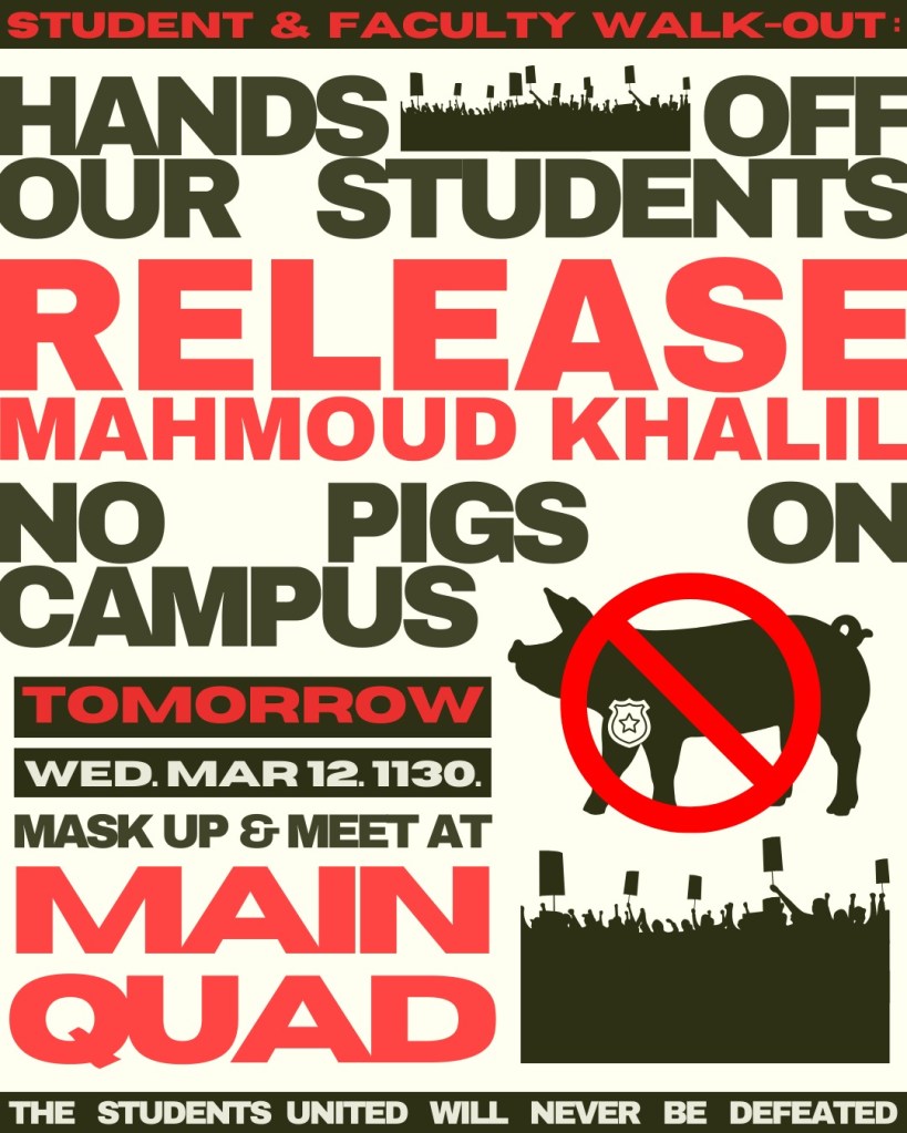 March 12th, Wednesday – Hands Off Our Students: Rally in solidarity with the campaign to call for the release of Mahmoud Khalil.