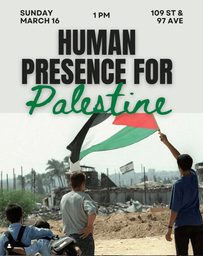 March 16th, Sunday – Human Presence for Palestine: “We show up because silence is not an option. We stand because injustice anywhere is a threat to justice everywhere. Join us this Sunday and be part of the movement. ✊🏽❤️