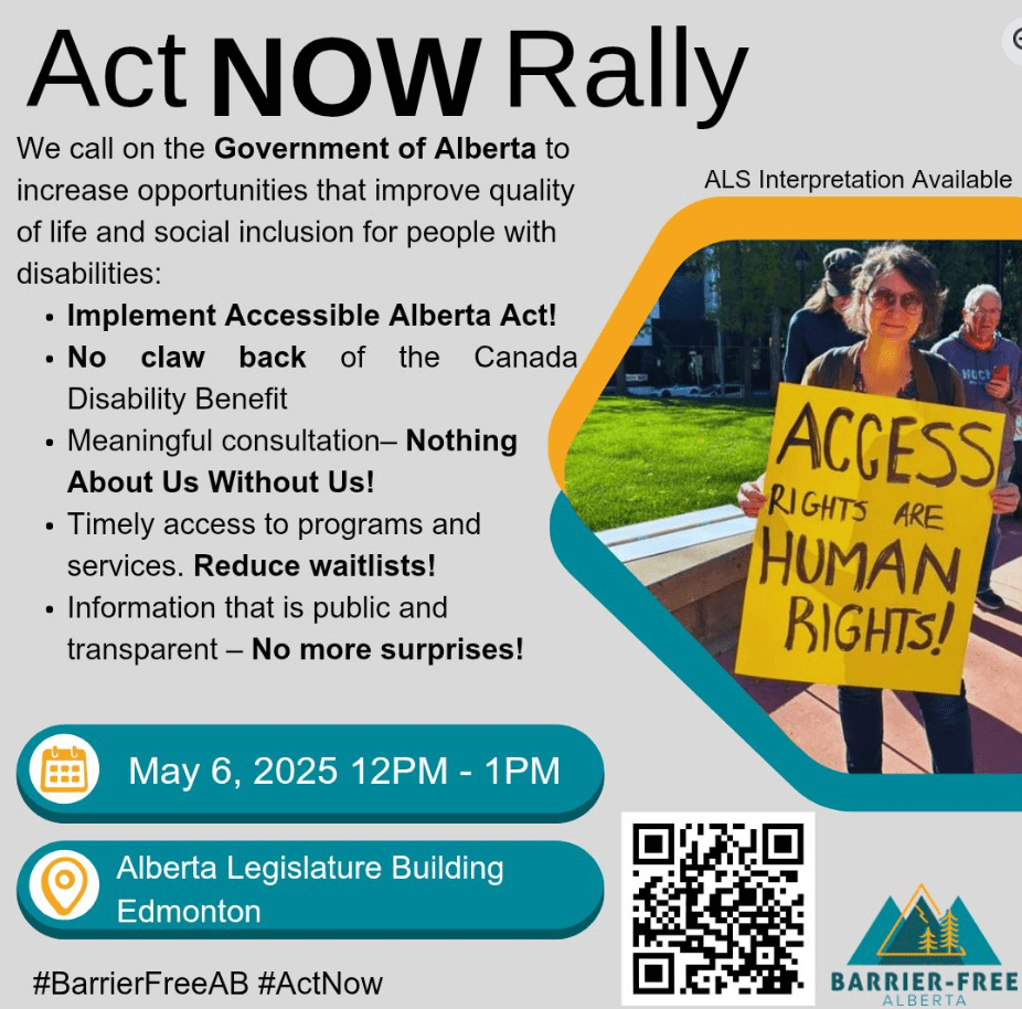May 6th, Tuesday – Act NOW Rally: “On May 6, Albertans will come together at the Legislature to demand real change—because access, dignity, and inclusion shouldn’t be optional.