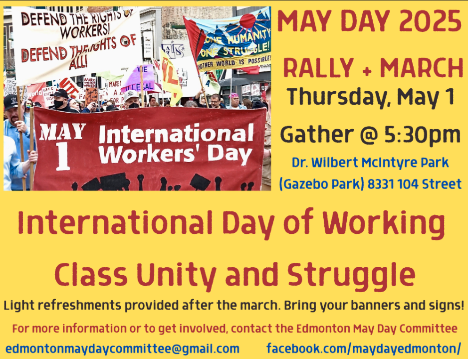 April 26th, Saturday – Resistance Rally: “The Alberta Federation of Labour (AFL) and allies are organizing a “Resistance Rally” to be held at the Alberta Legislature on April 26th at 2:30pm. The rally is for all Albertans who are dissatisfied with the current direction being taken by the provincial government and who want to advocate for a stronger Alberta within a united Canada.
