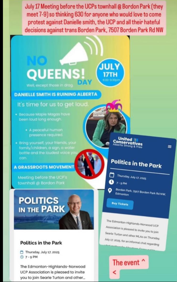 July 17th, Thursday – No Queens Day: One June 14th, over 12 million people took to the streets in the USA to host a No Kings Day rally in opposition to the Trump regime. Someone is floating the idea to host cross Alberta actions to show our opposition to the Danielle Smith regime – No Queens Day.