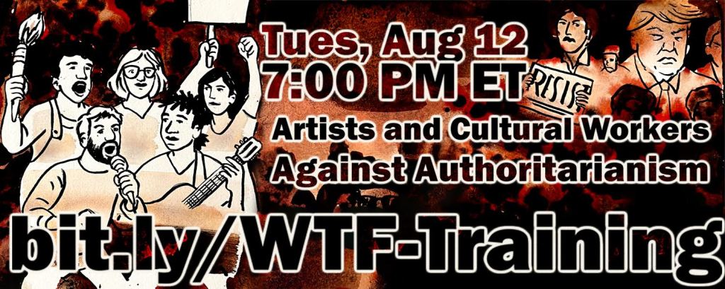August 12th, Tuesday – Artists and Cultural Workers Against Authoritarianism: “Authoritarianism is on the rise globally — AND so is our power to push back. Artists and cultural workers play a pivotal role in successful people-powered movements, shaping what’s possible through story, symbol, and song and moving/inspiring people to courageous action.
