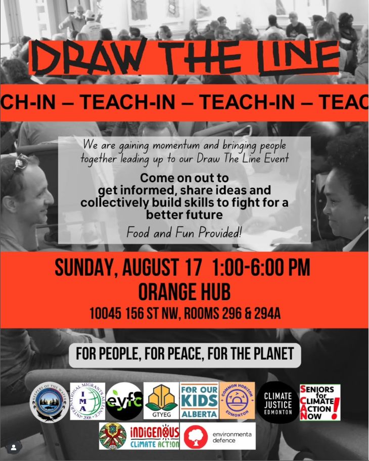 August 17th, Sunday – Draw The Line Teach-In: “We are gaining momentum and bringing people together leading up to our Draw The Line Event. Come on out to get informed, share ideas and collectively build skills to fight for a better future. Food and Fun Provided! Teach In Itinerary: -Draw The Line – for People, For Peace, For the Planet -Neolib and Migration, Bill C2 Workshop -Indigenous Movement Theory -Organizers Training -Social We are Stronger Together! Join our Growing Coalition: Keepers of the Water, Edmonton Youth For Climate, For Our Kids Alberta, Common Horizon Edmonton, Environmental Defence, Indigenous Climate Action, Grow Together Edmonton, Migrant Rights Alliance, Climate Justice Edmonton, Seniors for Climate Action Now! Edmonton”