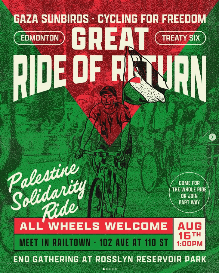 On Saturday August 16, we ride/roll in YEG in solidarity with all of Palestine and especially people in Gaza who are held under siege. We ride to mourn the 61,200+ people martyred in Gaza, including 18,400+ children. As people who value disability justice, we roll to acknowledge the 152,000+ Gazans wounded by Israel since October 2023 who have been denied access to adequate care and recovery supports, and the physical and mental injuries inflicted on everyone in Gaza through 22 months of destruction, displacement, denial of access to clean water, and manufactured famine. In recognition of Prisoners Justice Day we ride to honor the 10,400 Palestinians currently being held hostage in Israel’s prisons, including 440 children. We roll to be in community with other people who care about the world and are committed to ending oppression, occupation, and violence.