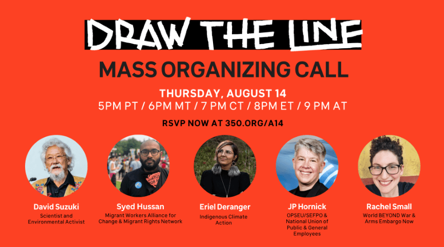 August 14th, Thursday – Draw the Line: “Join us on August 14th to hear from a powerful cross-movement panel about the interconnectedness of our struggles and why we are uniting on September 20th to Draw the Line and demand that Prime Minister Carney and the Canadian government pick a side: injustice, violence, and climate destruction— or a just and safe future for all of us.